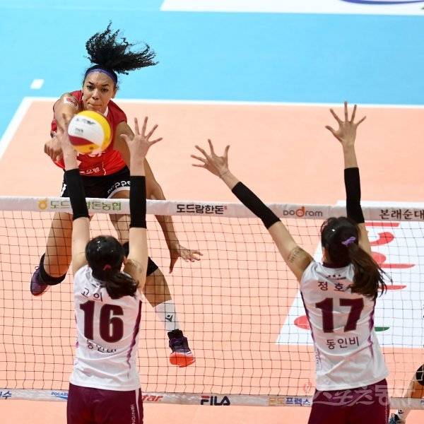 19일 광주 염주종합체육관에서 열린 ‘도드람 2021~2022 V-리그’ 여자부 페퍼저축은행과 KGC인삼공사 경기에서 페퍼저축은행 엘리자벳이 KGC인삼공사의 블로킹 사이로 스파이크 공격을 하고 있다.