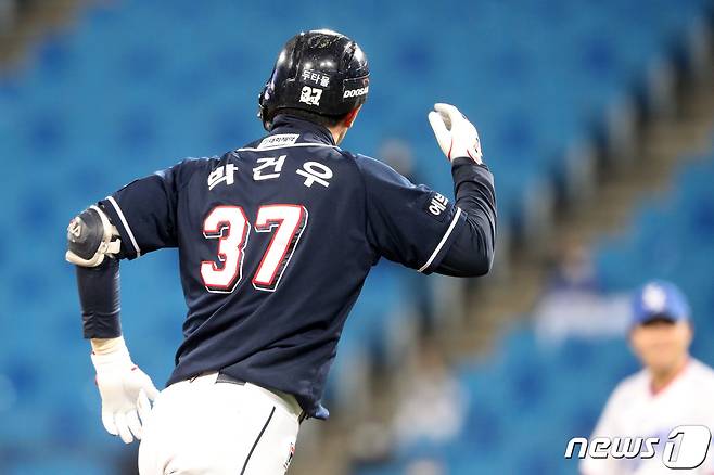 (대구=뉴스1) 공정식 기자 = 19일 오후 대구 삼성라이온즈파크에서 열린 '2021 프로야구 신한은행 SOL KBO리그' 두산 베어스와 삼성 라이온즈의 경기, 9회초 1사 주자 없는 상황 두산 3번타자 박건우가 삼성 최채흥을 상대로 좌중간 담장 넘어가는 솔로홈런을 날린 뒤 베이스를 돌아 홈으로 향하고 있다. 2021.10.19/뉴스1
