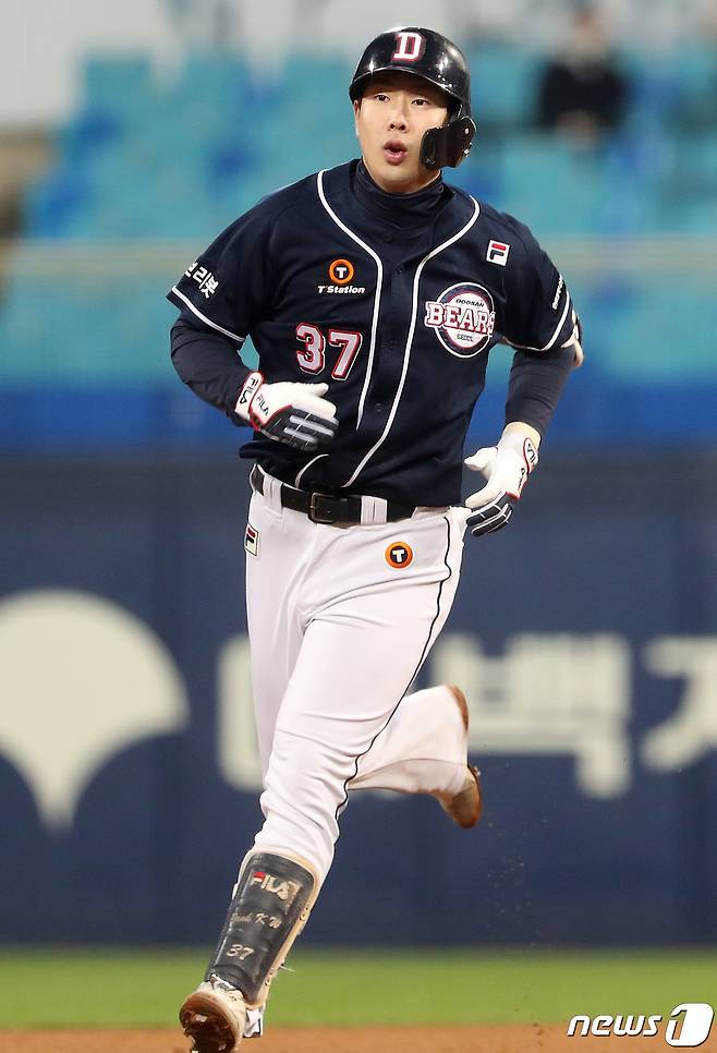 (대구=뉴스1) 공정식 기자 = 19일 오후 대구 삼성라이온즈파크에서 열린 '2021 프로야구 신한은행 SOL KBO리그' 두산 베어스와 삼성 라이온즈의 경기, 9회초 1사 주자 없는 상황 두산 3번타자 박건우가 삼성 최채흥을 상대로 좌중간 담장 넘어가는 솔로홈런을 날린 뒤 베이스를 돌아 홈으로 향하고 있다. 2021.10.19/뉴스1