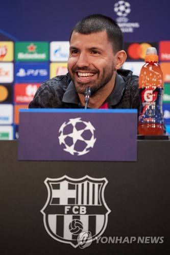 epa09532083 FC Barcelona's Sergio Aguero smiles during a press conference at Joan Gamper Sports City in Barcelona, Spain, 19 October 2021. FC Barcelona will face Dynamo Kiev in their UEFA Champions League group E soccer match on 20 October 2021. EPA/Alejandro Garcia