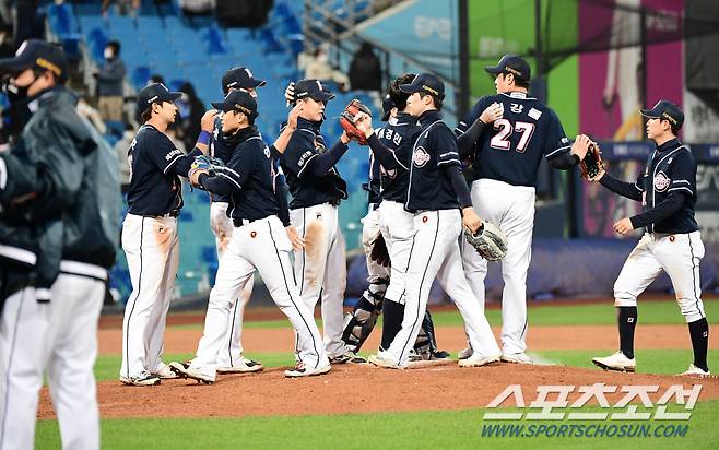 19일 대구 삼성라이온즈파크에서 KBO리그 삼성과 두산의 경기가 열렸다. 두산이 삼성에 승리했다. 경기 종료 후 승리의 기쁨을 나누고 있는 두산 선수들. 대구=송정헌 기자 songs@sportschosun.com/2021.10.19/