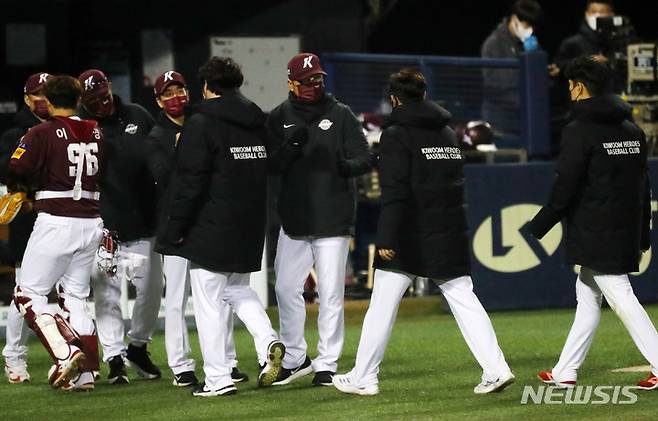 [서울=뉴시스] 배훈식 기자 = 수도권 야구장 관중 입장이 재개된 19일 오후 서울 송파구 잠실야구장에서 열린 2021 KBO리그 LG 트윈스와 키움 히어로즈와의 경기, 5대 4로 승리한 홍원기 키움 감독이 선수들과 하이파이브를 하고 있다. 2021.10.19. dahora83@newsis.com