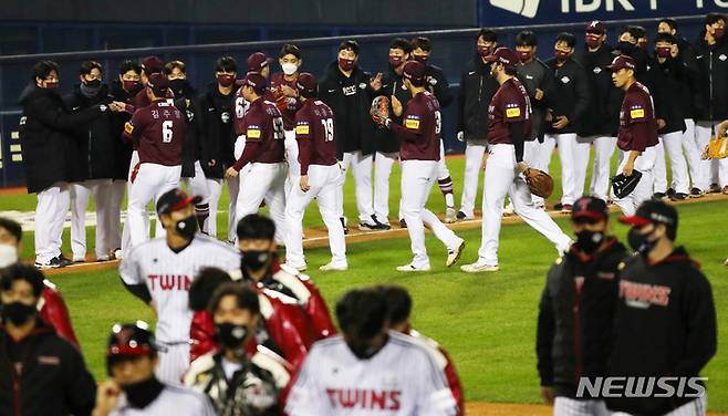 [서울=뉴시스] 배훈식 기자 = 수도권 야구장 관중 입장이 재개된 19일 오후 서울 송파구 잠실야구장에서 열린 2021 KBO리그 LG 트윈스와 키움 히어로즈와의 경기, 5대 4로 승리한 키움 선수들이 하이파이브를 하고 있다. 2021.10.19. dahora83@newsis.com