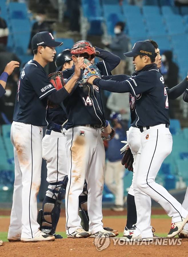 (대구=연합뉴스) 김현태 기자 = 19일 오후 대구 삼성라이온즈파크에서 열린 프로야구 '2021 프로야구 신한은행 SOL KBO리그' 두산 베어스와 삼성 라이온즈의 경기. 두산 선수들이 5:0으로 승리 후 기뻐하고 있다. 2021.10.19