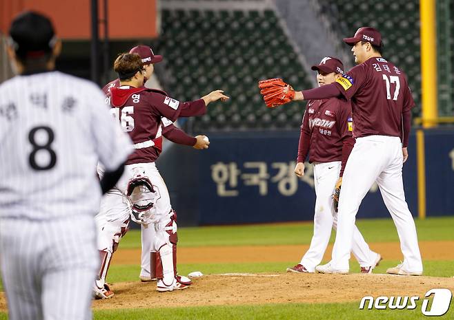(서울=뉴스1) 안은나 기자 = 19일 오후 서울 송파구 잠실야구장에서 열린 프로야구 2021 신한은행 SOL KBO리그 키움 히어로즈와 LG 트윈스의 경기가 5:4 키움 승리로 끝나자 마무리 투수 김태훈이 동료들과 주먹을 부딪히고 있다. 2021.10.19/뉴스1