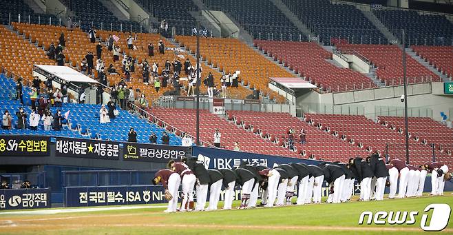 (서울=뉴스1) 안은나 기자 = 19일 오후 서울 송파구 잠실야구장에서 열린 프로야구 2021 신한은행 SOL KBO리그 키움 히어로즈와 LG 트윈스의 경기가 5:4 키움 승리로 끝나자 선수들이 관중석을 향해 인사하고 있다. 2021.10.19/뉴스1