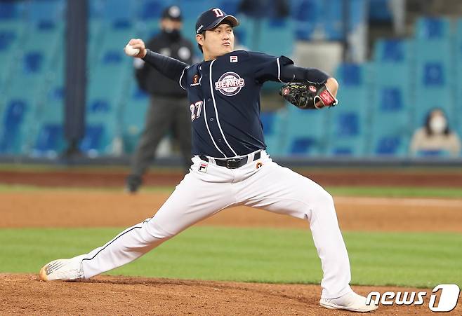 (대구=뉴스1) 공정식 기자 = 19일 오후 대구 삼성라이온즈파크에서 열린 '2021 프로야구 신한은행 SOL KBO리그' 두산 베어스와 삼성 라이온즈의 경기, 9회말 마운드에 오른 두산 김강률이 역투하고 있다. 2021.10.19/뉴스1