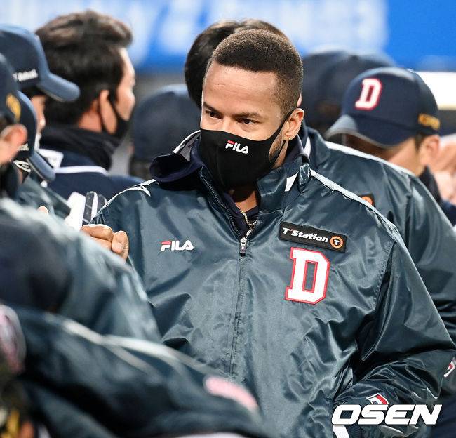 경기를 마치고 두산 승리투수 미란다가 승리의 하이파이브를 하고 있다. 2021.10.19 / rumi@osen.co.kr