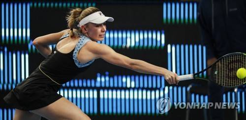 epa09532162 Ekaterina Alexandrova of Russia in action against Ons Jabeur of Tunisia during their women's first round match at the Kremlin Cup tennis tournament in Moscow, Russia, 19 October 2021. EPA/YURI KOCHETKOV