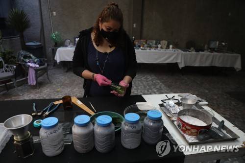 epa09532188 The artisan Susana Paniagua cuts glass bottles to make crafts with Day of the Dead motifs, in Mexico City, Mexico, 18 October 2021 (issued 19 October 2021). Mexican artisans get ready for one of the most fruitful and spiritual times of the year, the Day of the Dead which is celebrated on 01 and 02 November. EPA/Sáshenka Gutiérrez