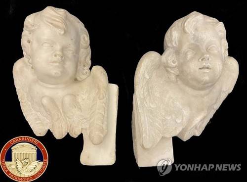 Two marble statues of angels are seen in this undated image. A British art collector who bought a pair of 17th century marble angels from a Neapolitan antiques shop two decades ago and had them at his French home has returned the “putti” to Italy’s art police after learning that they had been stolen from a church. In a statement released Tuesday Oct. 19, 2021 Italy’s carabinieri art police said the unnamed collector had tried to resell the angels at an antiques shop in Avignon, France ahead of his planned move from France to Portugal when French art police identified them as possible stolen goods. (Carabinieri for the Protection of Cultural Heritage via AP) AP PROVIDES ACCESS TO THIS THIRD PARTY PHOTO SOLELY TO ILLUSTRATE NEWS REPORTING OR COMMENTARY ON FACTS DEPICTED IN IMAGE; MUST BE USED WITHIN 14 DAYS FROM TRANSMISSION; NO ARCHIVING; NO LICENSING; MANDATORY CREDIT