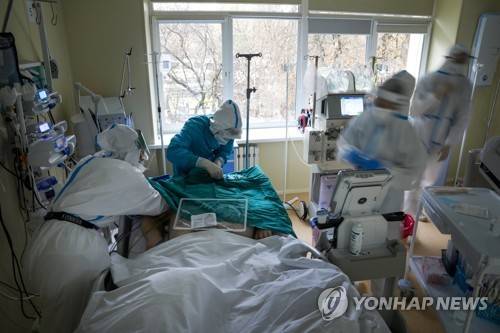 Medics wearing a special suit to protect against coronavirus treat a patient with coronavirus at an ICU at the Moscow City Clinical Hospital 52, in Moscow, Russia, Tuesday, Oct. 19, 2021. Russia hit another daily record of coronavirus deaths Tuesday as rapidly surging infection rates raised pressure on the country's health care system and prompted the government to suggest declaring a nonworking week.(AP Photo/Alexander Zemlianichenko)