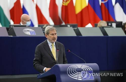 epa09532247 European Commissioner for Budget and Administration Johannes Hahn delivers a speech during a debate on 'General budget of the European Union for the financial year 2022' at the European Parliament in Strasbourg, France, 19 October 2021. EPA/RONALD WITTEK / POOL
