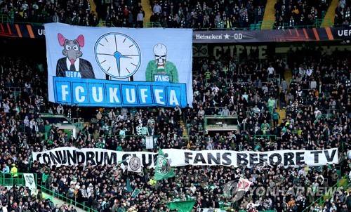 epa09532250 Supporters of Celtic Glasgow display a protest banner before the UEFA Europa League group G soccer match between Celtic Glasgow and Ferencvaros Budapest in Glasgow, Britain, 19 October 2021. EPA/ROBERT PERRY
