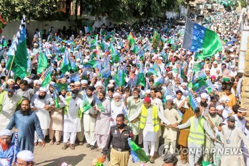 epa09532255 Pakistani men rally as they celebrate Eid-Milad-ul-Nabi, the birthday of Prophet Mohammad, in Hyderabad, Pakistan, 19 October 2021. Eid-Milad-ul-Nabi is celebrated by Muslims every year on 12th of the Rabi-ul-Awal, the third month of the Islamic Calendar. EPA/NADEEM KHAWAR