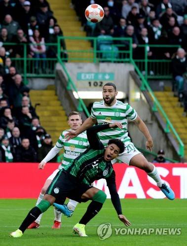 epa09532258 Cameron Carter-Vickers of Celtic (R) in action against Ryan Mmaee (C) of Ferencvaros during the UEFA Europa League group G soccer match between Celtic Glasgow and Ferencvaros Budapest in Glasgow, Britain, 19 October 2021. EPA/ROBERT PERRY