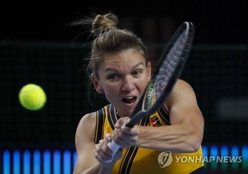 epa09532266 Simona Halep of Romania in action during her match against Anastasia Potapova of Russia at the Kremlin Cup tennis tournament in Moscow, Russia, 19 October 2021. EPA/YURI KOCHETKOV