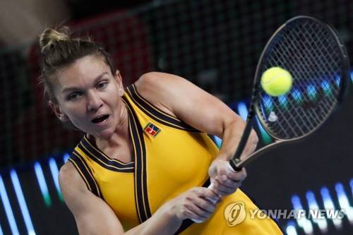 epa09532267 Simona Halep of Romania in action during her match against Anastasia Potapova of Russia at the Kremlin Cup tennis tournament in Moscow, Russia, 19 October 2021. EPA/YURI KOCHETKOV