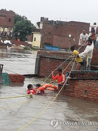 This photograph provided by India's National Disaster Response Force (NDRF) shows NDRF soldiers rescue people stranded in floodwaters in Udham Singh Nagar, Uttarakhand state, India, Tuesday, Oct. 19, 2021. More than 20 people have died and many are missing in floods triggered by heavy rains in the northern Indian state of Uttarakhand, officials said Tuesday. (National Disaster Response Force via AP) AP PROVIDES ACCESS TO THIS PUBLICLY DISTRIBUTED HANDOUT PHOTO PROVIDED BY INDIA'S NATIONAL DISASTER RESPONSE FORCE-MANDATORY CREDIT