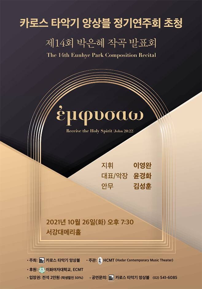 현재 이화여대 음악대 작곡가 교수인 박은혜는 13회의 개인 작곡 발표회를 개최했다. 성경적 세계관의 견고한 기초 위에 창의적인 현대 음악의 다양한 어법을 활용한 창작 활동을 펼치고 있다. 타악기 연주자인 이영완은 1989년 타악기 앙상블의 불모지였던 당시 최초로 프로 타악기 앙상블을 조직해서 카로스 타악기 앙상블을 이끌고 있다. 서울 서강대메리홀에서 10월 26일.