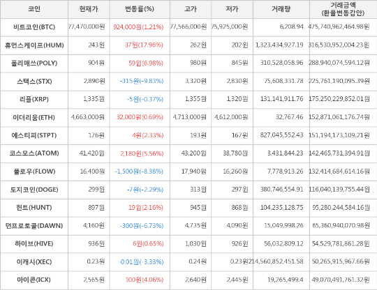 또한, 폴리매쓰(6.98%, 904원), 코스모스(5.56%, 41,420원), 아이콘(4.06%, 2,565원), 에스티피(2.33%, 176원), 헌트(2.16%, 897원), 이더리움(0.69%, 4,663,000원), 하이브(0.65%, 936원)가 상승세를 나타냈다.