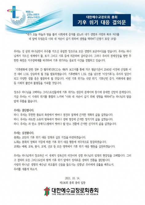 대한예수교장로회(예장) 통합 총회(총회장 류영모 목사)가 최근 기후위기 대응을 위한 결의문(사진)을 발표했다.