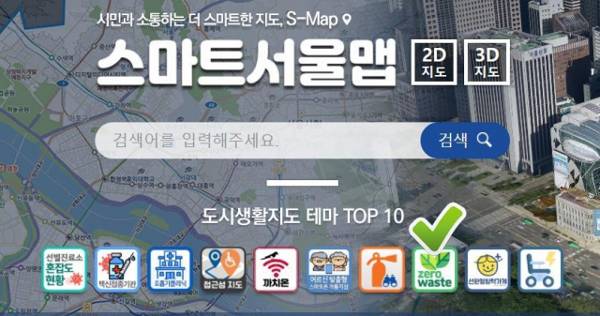서울시는 19일 지자체 최초로 70여개 제로웨이스트(Zero Waste) 상점의 위치 정보를 '스마트서울맵(사진)'으로 공개한다고 밝혔다.