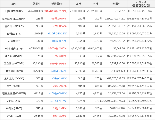 또한, 코스모스(9.91%, 43,130원), 폴리매쓰(8.52%, 917원), 에스티피(4.07%, 179원), 아이콘(3.25%, 2,545원), 헌트(2.62%, 901원), 이더리움(2.05%, 4,726,000원), 하이브(1.61%, 945원)가 상승세를 나타냈다.