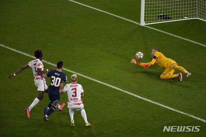 [파리=AP/뉴시스] 파리 생제르맹(PSG·프랑스)의 리오넬 메시(30번)가 19일(현지시간) 프랑스 파리의 파르크 데 프랭스에서 열린 2021-22시즌 유럽축구연맹(UEFA) 챔피언스리그 조별리그 A조 3차전 라이프치히(독일)와의 경기 후반 22분 팀의 두 번째 골을 넣고 있다. 메시는 후반 29분엔 역전 골을 넣는 등 멀티 골을 기록하며 팀의 3-2 승리를 이끌었다. 2021.10.20.