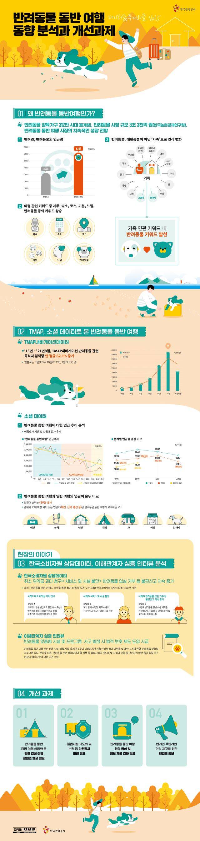 소셜네트워크 분석 결과 반려견·반려동물에 대한 언급량은 2019년 연간 2224건에서 2021년 6개월 동안 6165건 등 지속적으로 증가하고 있으며, 여행 빈도가 높은 ‘여름철(6~8월)’과 ‘주말’에 집중되고 있는 것으로 나타났다. 반려동물 동반여행지로 관심이 높은 곳은 ‘제주→서울→부산’ 순으로 나타났다. 제주 및 강원은 자연·풍경에 대한 관심이 높고, 서울 및 부산은 문화·명소에 대한 관심이 높은 것으로 나타났으며, 경기 지역은 캠핑 등 액티비티·체험 관련 언급이 많았다.