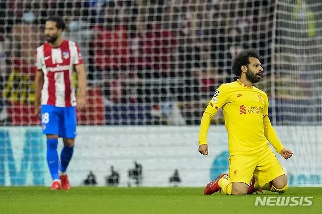 [마드리드=AP/뉴시스] 리버풀(잉글랜드)의 모하메드 살라가 19일(현지시간) 스페인 마드리드의 완다 메트로폴리타노에서 열린 2021-22시즌 유럽축구연맹(UEFA) 챔피언스리그(UCL) B조 3차전 아틀레티코 마드리드(스페인)와의 경기 전반 8분 선제골을 넣고 세리머니 하고 있다. 살라는 후반 32분에는 PK로 결승 골을 넣어 멀티 골을 기록하며 팀의 3-2 승리를 이끌었다. 2021.10.20.
