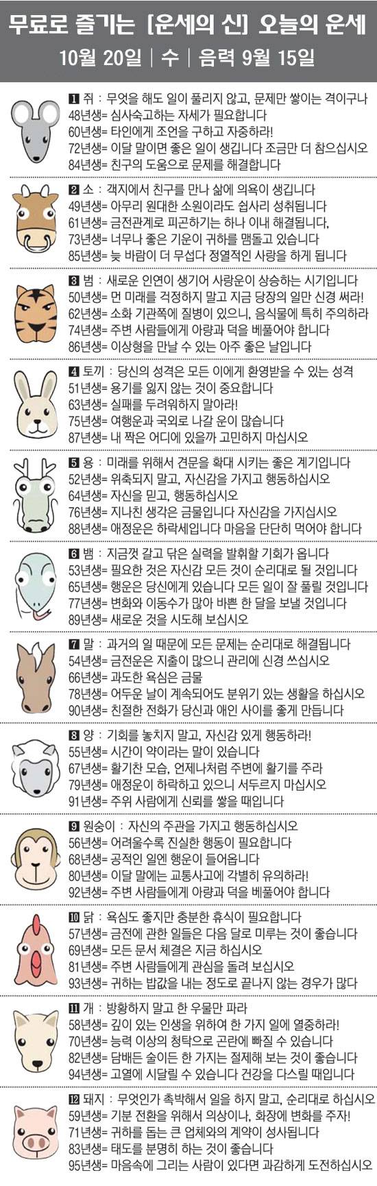 스포츠조선에서 제공하는 10월 20일(음력 9월 15일) 오늘의 운세입니다.