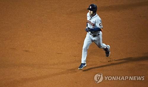 epa09533294 Houston Astros batter Alex Bregman circles the bases after hitting a solo home run against the Boston Red Sox in the top of the first inning of game four of the MLB American League Championship Series between the Boston Red Sox and the Houston Astros at Fenway Park in Boston, Massachusetts, USA, 19 October 2021. EPA/JOHN CETRINO