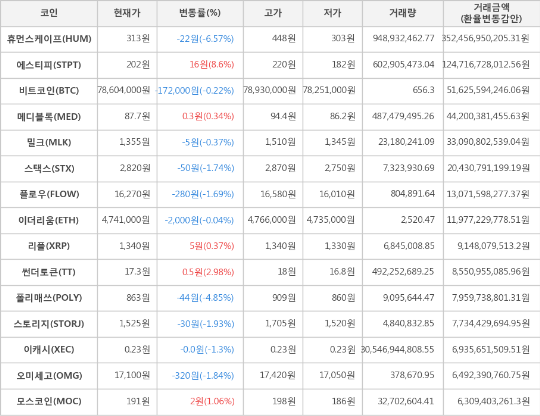 하락세를 보이는 가상화폐는 총 9종목으로 이 중 가장 큰 하락세를 보이는 휴먼스케이프는 전일 대비 -6.57% 하락한 313원에 거래되고 있다.
