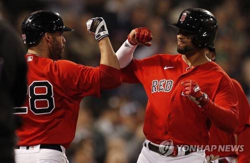epa09533300 Boston Red Sox batter Xander Bogaerts (R) celebrates with on deck batter J.D. Martinez (L) after hitting a two-run home run against the Houston Astros in the bottom of the first inning of game four of the MLB American League Championship Series between the Boston Red Sox and the Houston Astros at Fenway Park in Boston, Massachusetts, USA, 19 October 2021. EPA/CJ GUNTHER