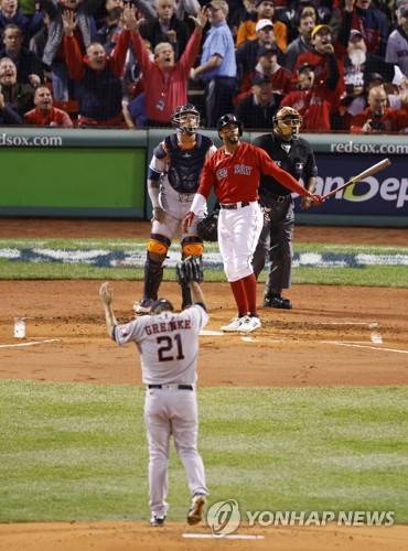 epa09533305 Boston Red Sox batter Xander Bogaerts hits a two-run home run against the Houston Astros in the bottom of the first inning of game four of the MLB American League Championship Series between the Boston Red Sox and the Houston Astros at Fenway Park in Boston, Massachusetts, USA, 19 October 2021. EPA/RHONA WISE