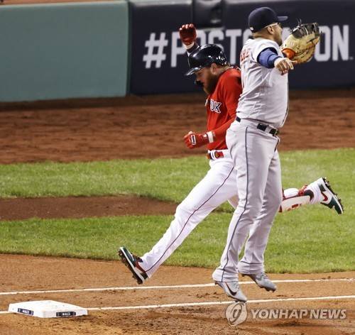 epa09533306 Boston Red Sox batter Alex Verdugo (L) reaches first base safely, avoiding the tag by Houston Astros first baseman Yuli Gurriel (R) on a throwing error by Alex Bregman (not pictured) in the bottom of the first inning of game four of the MLB American League Championship Series between the Boston Red Sox and the Houston Astros at Fenway Park in Boston, Massachusetts, USA, 19 October 2021. EPA/JOHN CETRINO EPA-EFE/JOHN CETRINO