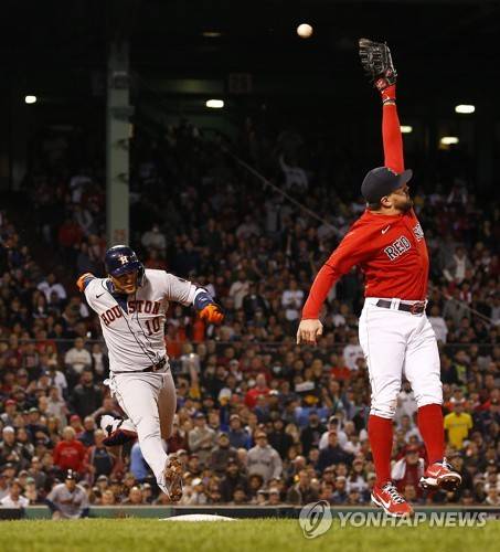 epa09533314 Boston Red Sox first baseman Kyle Schwarber (R) cannot catch the errant throw by third baseman Rafael Devers (not pictured) allowing Houston Astros batter Yuli Gurriel (L) to advance to second base on an infield single in the top of the second inning of game four of the MLB American League Championship Series between the Boston Red Sox and the Houston Astros at Fenway Park in Boston, Massachusetts, USA, 19 October 2021. EPA/CJ GUNTHER