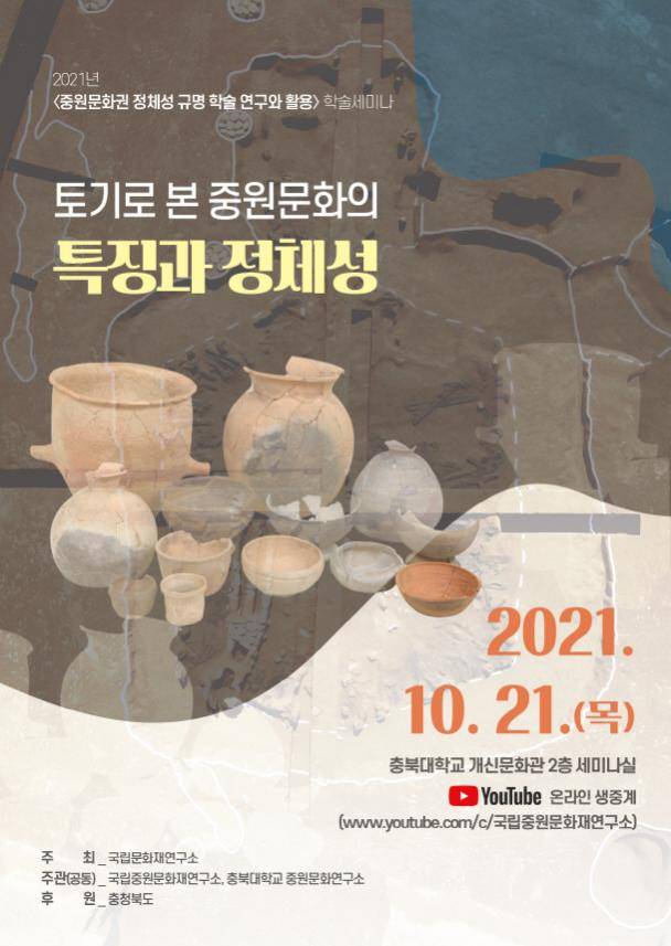 문화재청 국립중원문화재연구소(소장 문재범)는 오는 21일 오전 10시부터 청주 충북대학교 개신문화관에서 ‘토기로 본 중원문화의 특징과 정체성’을 주제로 충북대학교 중원문화연구소와 공동으로 학술세미나를 개최한다. 이번 행사는 코로나19 방지를 위해 국립중원문화재연구소 유튜브로 온라인 생중계할 예정이다.