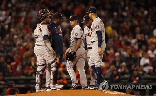 epa09533317 Houston Astros starting pitcher Zack Greinke (C) is removed from the game by manager Frank Thomas (2L) in the bottom of the second inning of game four of the MLB American League Championship Series between the Boston Red Sox and the Houston Astros at Fenway Park in Boston, Massachusetts, USA, 19 October 2021. EPA/CJ GUNTHER