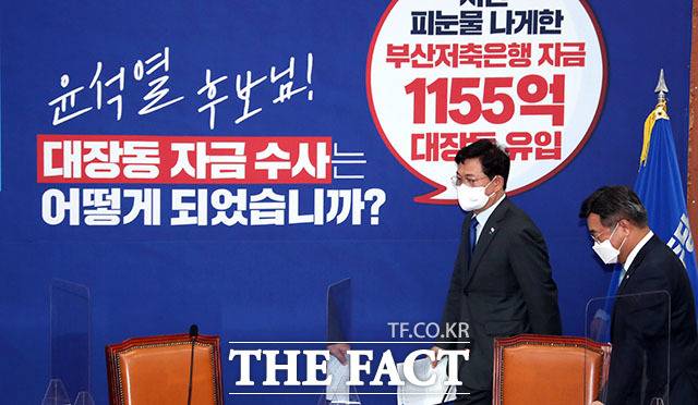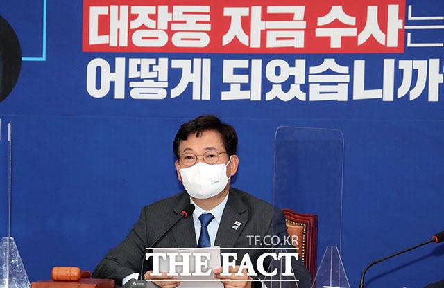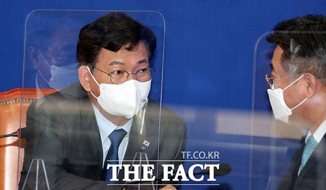 [더팩트ㅣ국회=남윤호 기자] 송영길 더불어민주당 대표(왼쪽)가 20일 오전 서울 여의도 국회에서 열린 최고위원회의에서 윤호중 원내대표와 이야기하고 있다.