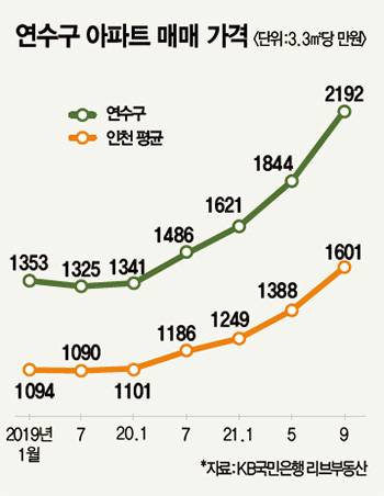 KB국민은행 리브부동산에 따르면 9월 말 기준 송도국제도시가 위치한 인천 연수구 아파트 매매 가격은 3.3㎡당 평균 2192만원을 기록했다. 지난 1월만 해도 3.3㎡당 1621만원이었던 데 반해 올 들어서만 35.2%(3.3㎡당 571만원) 급등했다. 전용 84㎡(옛 34평)를 기준으로 하면 올 초보다 평균 1억8414만원은 더 줘야 한다는 얘기다.