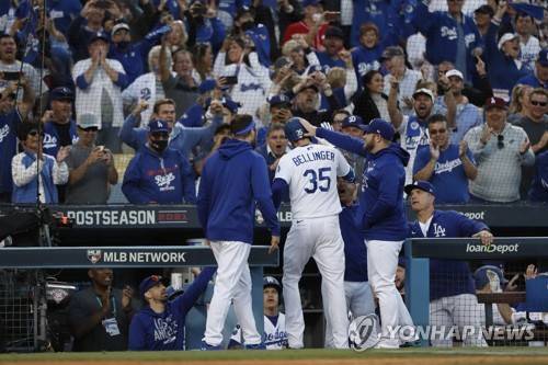epa09533327 Los Angeles Dodgers Cody Bellinger (C) is greeted outside the dugout by Los Angeles Dodgers manager Dave Roberts (3-R) and teammates after Belinger hit a three-run home run off Atlanta Braves relief pitcher Luke Jackson as Atlanta Braves catcher Travis d'Arnaud (Bottom) looks on during the eighth inning of game 3 of the National League Championship Series MLB playoff baseball game between the Atlanta Braves and the Los Angeles Dodgers at Dodgers Stadium in Los Angeles, California, USA, 19 October 2021. EPA/CAROLINE BREHMAN