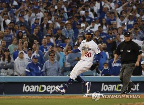 epa09533325 Los Angeles Dodgers Mookie Betts advances to third base against the Atlanta Braves during the eighth inning of game 3 of the National League Championship Series MLB playoff baseball game between the Atlanta Braves and the Los Angeles Dodgers at Dodgers Stadium in Los Angeles, California, USA, 19 October 2021. EPA/CAROLINE BREHMAN