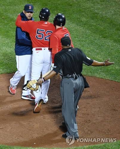 epa09533340 Boston Red Sox manager Alex Cora (L) is pulled away from home plate umpire Laz Diaz (R) by third base coach Carlos Febles (2L) and on deck batter Christian Vazquez (2R) as he argued a called third strike in the bottom of the third inning of game four of the MLB American League Championship Series between the Boston Red Sox and the Houston Astros at Fenway Park in Boston, Massachusetts, USA, 19 October 2021. EPA/JOHN CETRINO