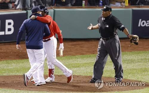 epa09533342 Boston Red Sox manager Alex Cora (L) is pulled away from home plate umpire Laz Diaz (R) by third base coach Carlos Febles (2L) and on deck batter Christian Vazquez (obscured) as he argued a called third strike in the bottom of the third inning of game four of the MLB American League Championship Series between the Boston Red Sox and the Houston Astros at Fenway Park in Boston, Massachusetts, USA, 19 October 2021. EPA/RHONA WISE