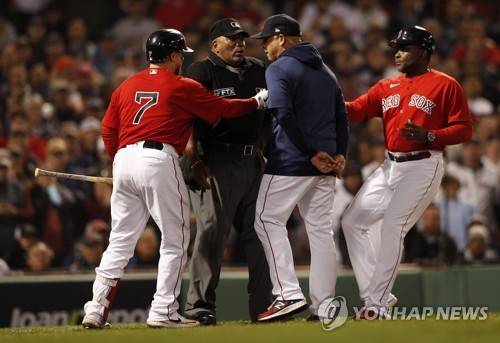 epa09533341 Boston Red Sox manager Alex Cora (2R) is pulled away from home plate umpire Laz Diaz (2L) by third base coach Carlos Febles (R) and on deck batter Christian Vazquez (L) as he argued a called third strike in the bottom of the third inning of game four of the MLB American League Championship Series between the Boston Red Sox and the Houston Astros at Fenway Park in Boston, Massachusetts, USA, 19 October 2021. EPA/CJ GUNTHER