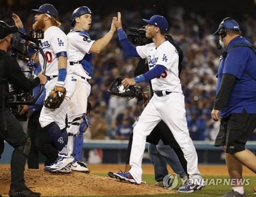 epa09533349 Los Angeles Dodgers first baseman Cody Bellinger (R), high-fives Los Angeles Dodgers catcher Will Smith (C) after defeating the Atlanta Braves in game 3 of the National League Championship Series MLB playoff baseball game between the Atlanta Braves and the Los Angeles Dodgers at Dodgers Stadium in Los Angeles, California, USA, 19 October 2021. EPA/CAROLINE BREHMAN