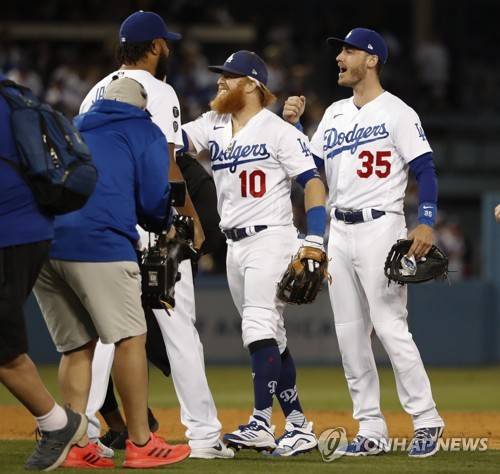 epa09533352 Los Angeles Dodgers first baseman Cody Bellinger (R), Los Angeles Dodgers third baseman Justin Turner (C) greet Los Angeles Dodgers relief pitcher Kenley Jansen (L) after defeatin the Atlanta Braves in game 3 of the National League Championship Series MLB playoff baseball game between the Atlanta Braves and the Los Angeles Dodgers at Dodgers Stadium in Los Angeles, California, USA, 19 October 2021. EPA/CAROLINE BREHMAN