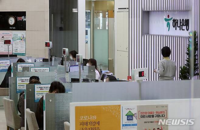 [서울=뉴시스] 백동현 기자 = 하나은행이 가계대출 총량 관리를 위해 일부 대출상품의 신규 신청을 중단한 20일 오전 서울 중구 하나은행 영업부에서 고객들이 상담을 받고 있다. 2021.10.20. livertrent@newsis.com